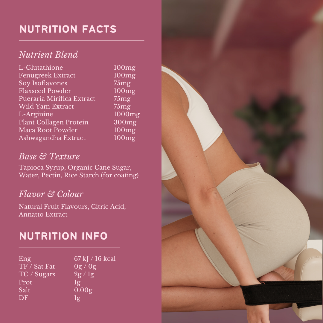 L-Glutathione, Fenugreek Extract, Soy Isoflavones, Flaxseed Powder, Pueraria Mirifica Extract, Wild Yam Extract, L-Arginine, Plant Collagen Protein, Maca Root Powder, Ashwagandha Extract, Tapioca Syrup, Organic Cane Sugar, Water, Pectin, Rice Starch (for Coating), Natural Fruit Flavours, Citric Acid, Annatto Extract